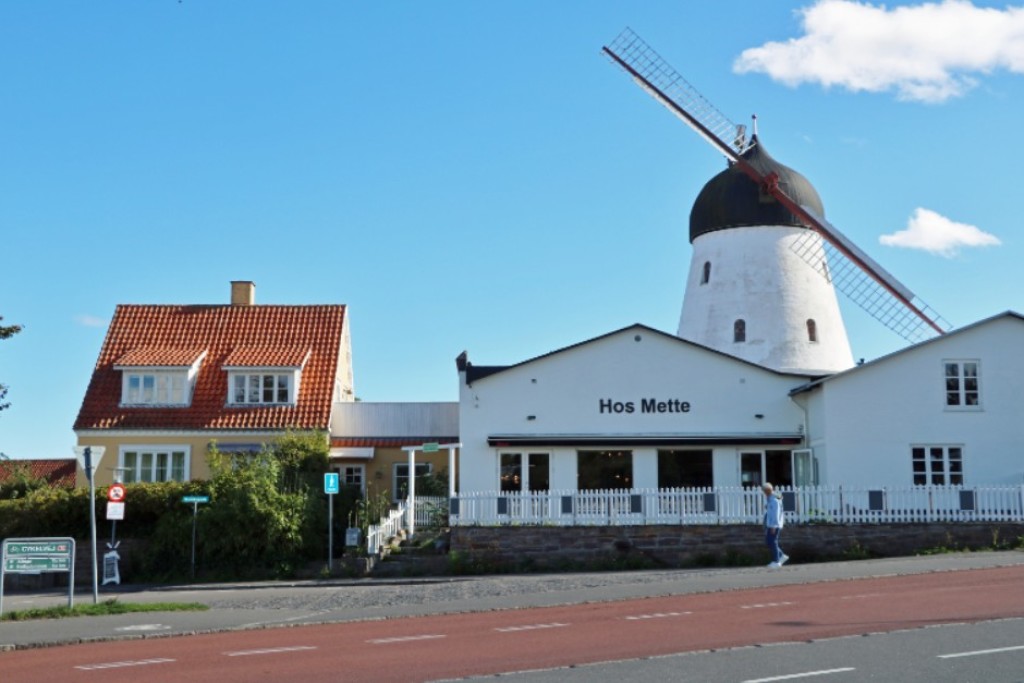 Indkørslen til Gudhjem går lige forbi den smukke gamle Mette Mølle, som er meget velholdt og i dag fungerer som restaurant.