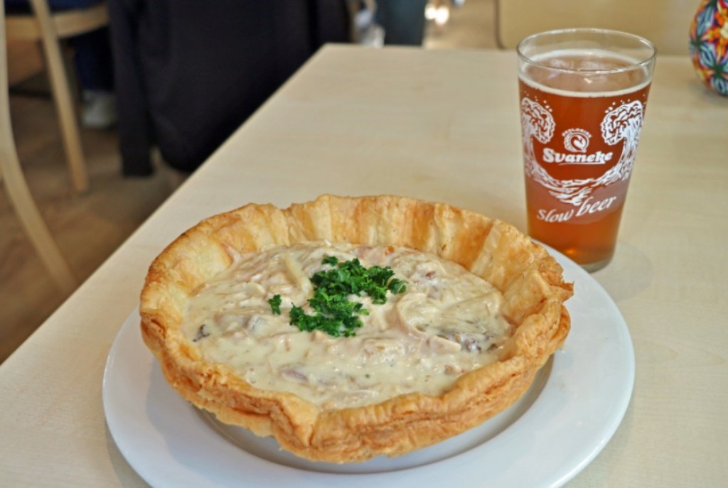 Lige ved parkeringspladsen ind til Ekkodalen, ligger en rigtig skøn restaurant, som er en af de 3 restauranter i Danmark, som serverer en stor tartelet som deres signaturret. Indholdet står de selv for, men tarteletten bages hos Konditor Bageren i Rønne. Det er blevet en tradition, at jeg første dag besøger stedet, for jeg kan som hovedregel først få mit hus eller lejlighed i løbet af eftermiddagen.