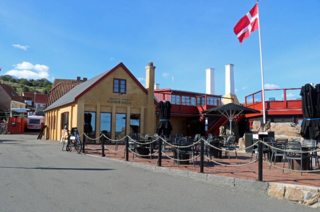 Nede på havnen fIndes det legendariske Gudhjem Røgeri, som hver dag kl. 11:00 har nyrøget fisk klar til kunderne, og selvfølgelig også til deres store kolde "fiskebåd"; det er super lækkert.